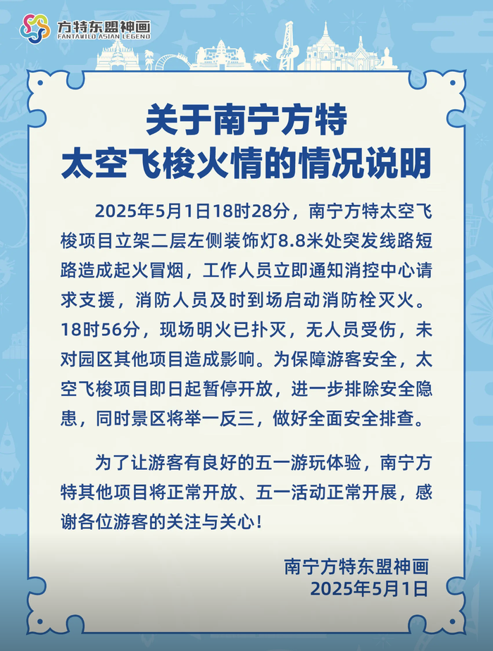 南宁方特东盟神画景区发布《关于南宁方特太空飞梭火情的情况说明》称,5月1日18时28分,南宁方特太空飞梭项目立架二层左侧装饰灯8.8米处突发线路短路造成起火冒烟。18时56分,现场明火已扑灭,无人员受伤,未对园区其他项目造成影响。为保障游客安全,太空飞梭项目即日起暂停开放,进一步排除安全隐患,同时景区将举一反三,做好全面安全排查。南宁方特其他项目将正常开放、五一活动正常开展。