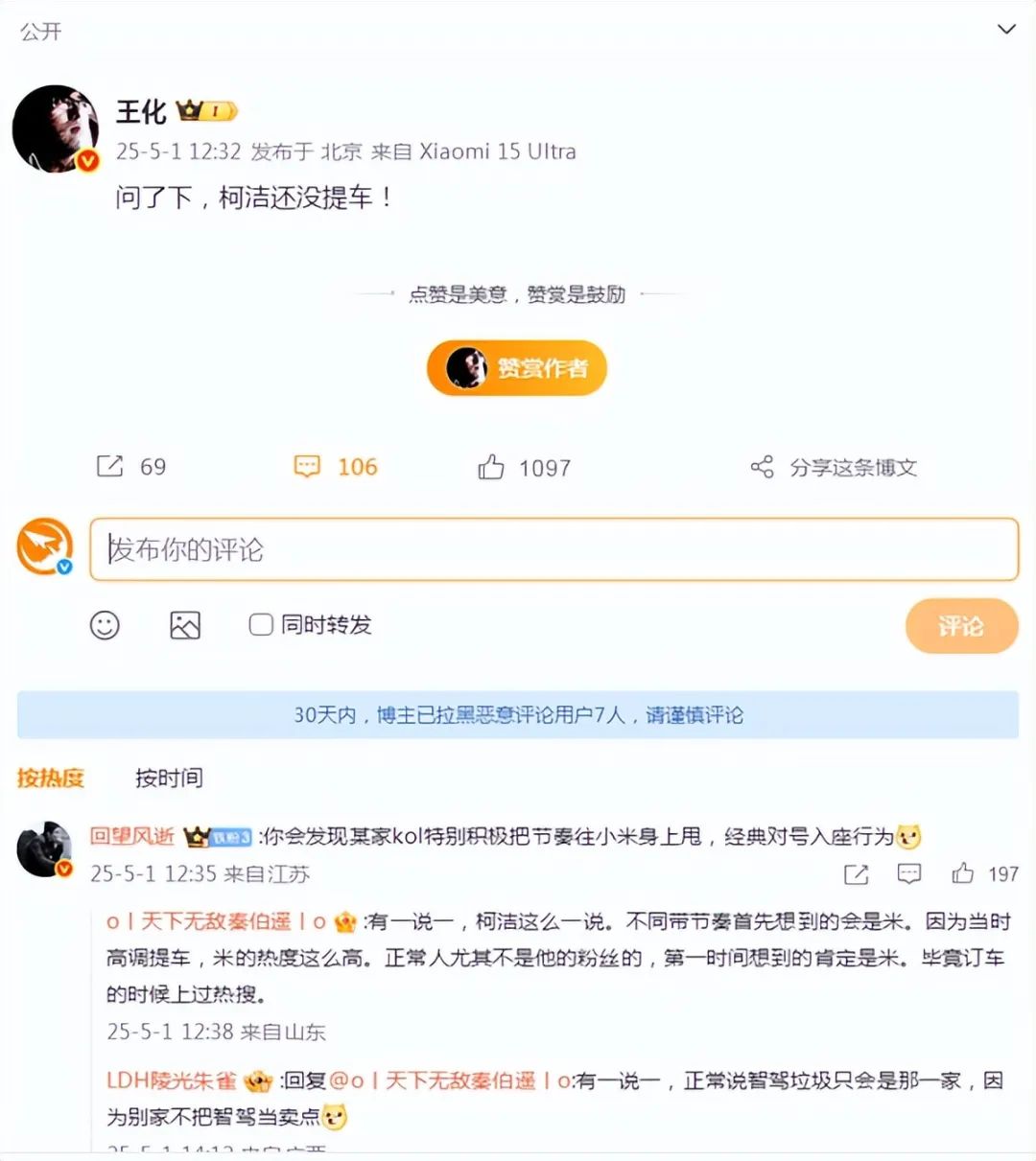 5月1日午间,小米集团公关部总经理王化微博发文,针对日前热议柯洁智驾事件表示:问了下,柯洁还没提车!