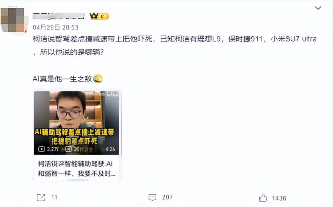 几乎就在同时,有网友在社交平台发出柯洁在直播中谈智能驾驶的视频片段,引发关注。柯洁在直播中称:“我好多天都不敢用那个智能驾驶,我觉得好蠢的东西,包括现在的一些自动驾驶,我觉得能不用最好不用,每次都给我吓得够呛,我也不说是什么车企的自动驾驶。”