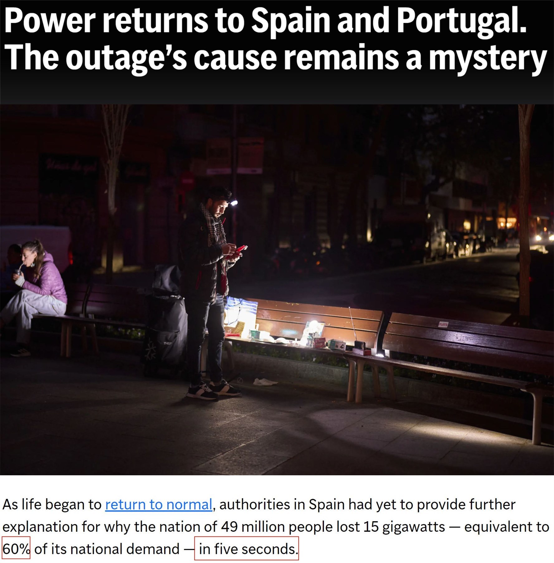 4月28日,西班牙和葡萄牙遭遇大规模停电。据美联社报道,此次停电是欧洲近年来最严重的断电事件之一。西班牙在短短5秒内失去了全国60%的电力供应。