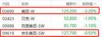 受此消息影响,京东集团-SW(09618.HK)跌2.20%、美团-W(03690.HK)跌0.93%。