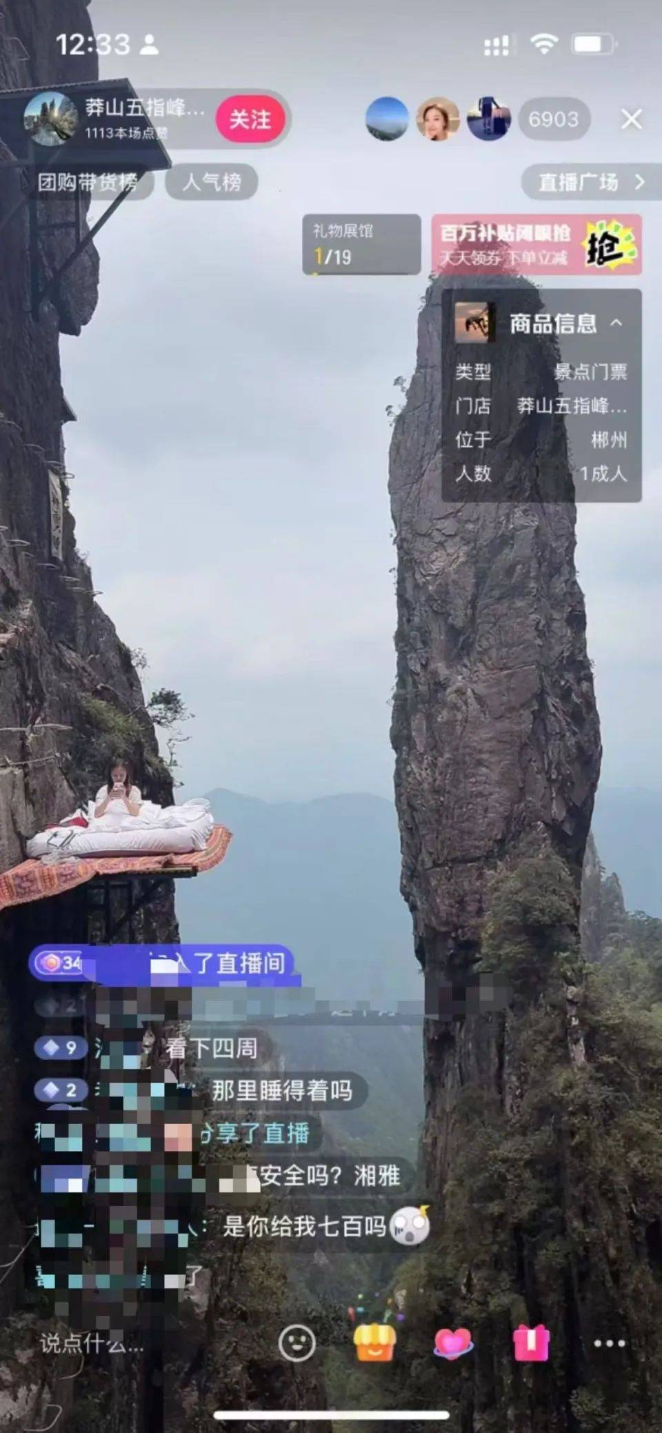 莽山五指峰景区官方账号在进行直播时,主推了悬崖睡床项目,画面显示,一名工作人员坐在睡床上,身上佩戴有安全绳,旁边是悬崖峭壁,当天的直播有近7000人在线观看。在评论区,有网友询问是否有危险性。