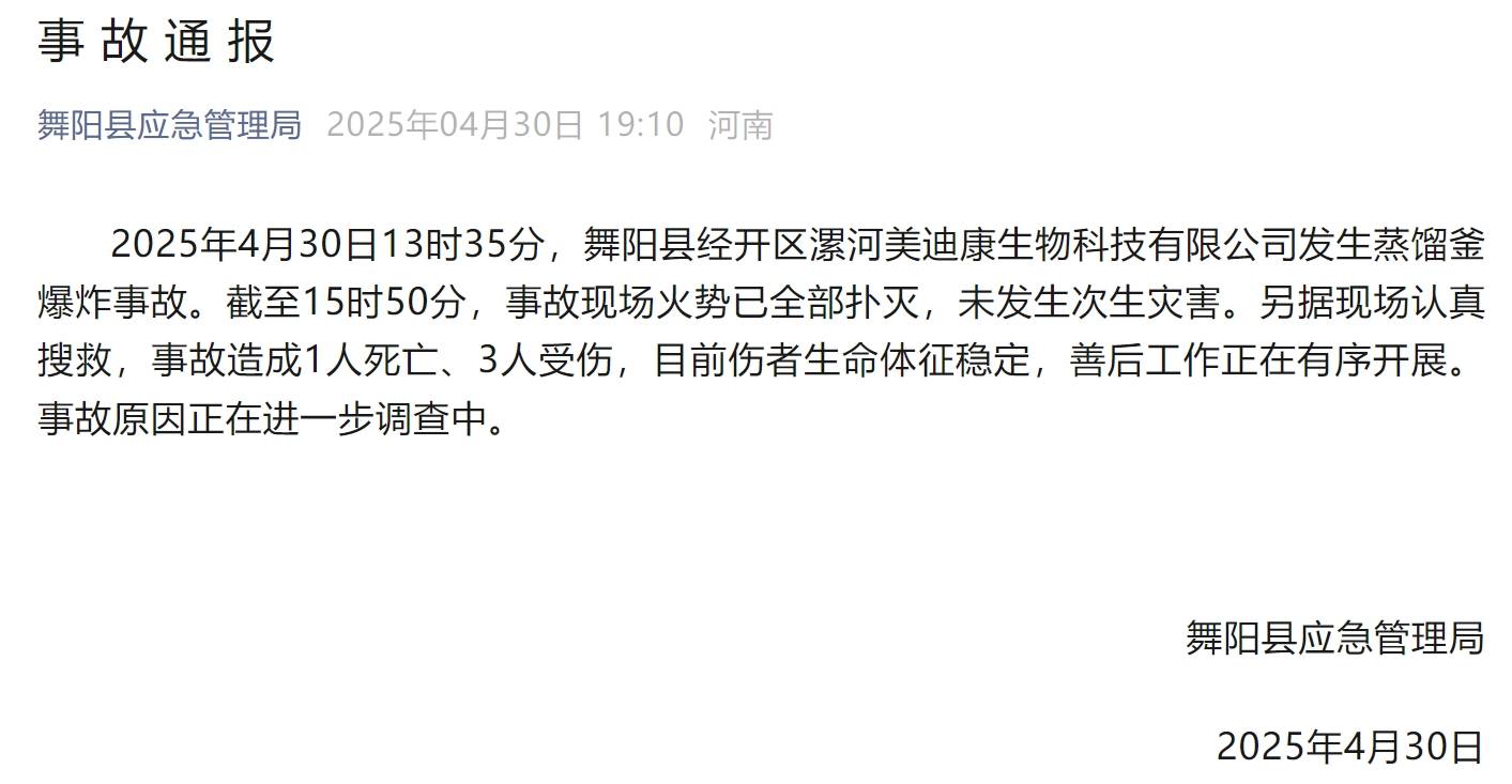 4月30日13时35分,舞阳县经开区漯河美迪康生物科技有限公司发生蒸馏釜爆炸事故。截至15时50分,事故现场火势已全部扑灭,未发生次生灾害。另据现场认真搜救,事故造成1人死亡、3人受伤,目前伤者生命体征稳定,善后工作正在有序开展。事故原因正在进一步调查中。