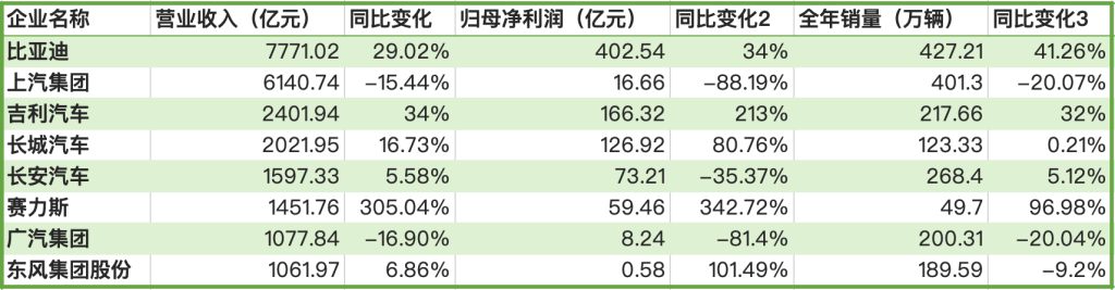 车企的销量普遍是营收最大影响因素。具体来看,比亚迪以427.21万辆的成绩稳居第一,同比增长41.26%;上汽集团全年销售401.3万辆,同比下降20.07%;吉利全年销量217.66万辆,同比增长32%;长安汽车销量268.4万辆,同比增长5.12%;广汽集团全年销售200.31万辆,同比下滑20.04%。长城汽车销量123.33万辆,同比仅微增0.21%;赛力斯全年销量49.7万辆,同比增长96.98%。东风集团股份销量下滑9.2%。