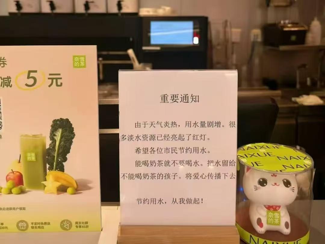 南都湾财社记者注意到,涉事门店为奈雪的茶(玖隆茂店),该门店于社交平台账号发布帖子称“能喝奶茶就不要喝水,节约用水从我做起”,并附上“一本正经的胡说八道”“抽象”的话题标签。此外,图片显示,门店张贴的通知显示,“由于天气炎热,用水量剧增。很多淡水资源已经亮起了红灯。希望各位市民节约用水,能喝奶茶就不要喝水。把水留给不能喝奶茶的孩子,将爱心传播下去”。