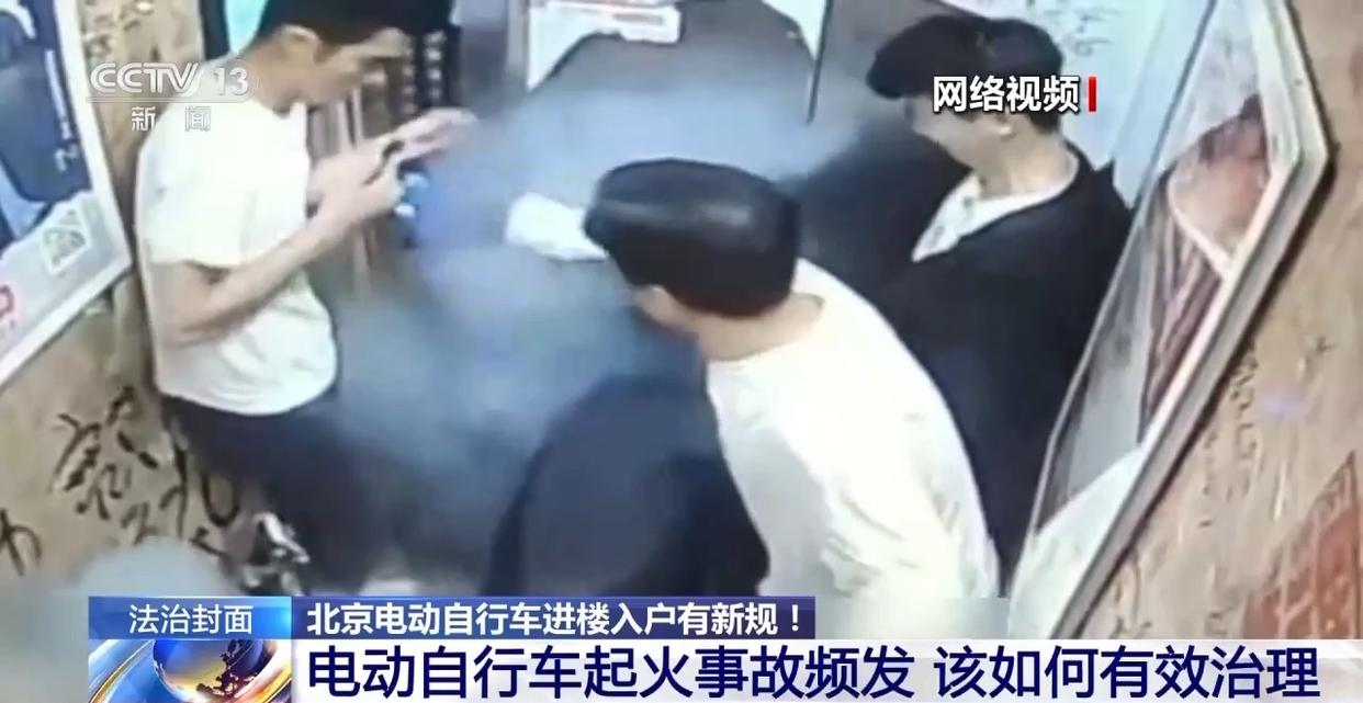在四川成都某小区,一名男子推着电动自行车进入电梯中,就在电梯门将要关闭时,电动自行车后方突然冒烟,随后开始起火,电梯内瞬间被火苗和烟雾覆盖。这起电动自行车爆燃事故共造成5人受伤,最小的伤者是一名仅5个月大的婴儿。