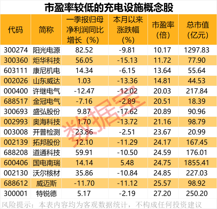本月以来,充电设施概念股普遍回调,平均下跌8.15%,麦格米特、绿能慧充跌幅超过20%。股价回调后,部分个股估值已处于相对低位,阳光电源、炬华科技、康尼机电、山东威达最新市盈率不足15倍,其中阳光电源最新市盈率创2019年以来新低。