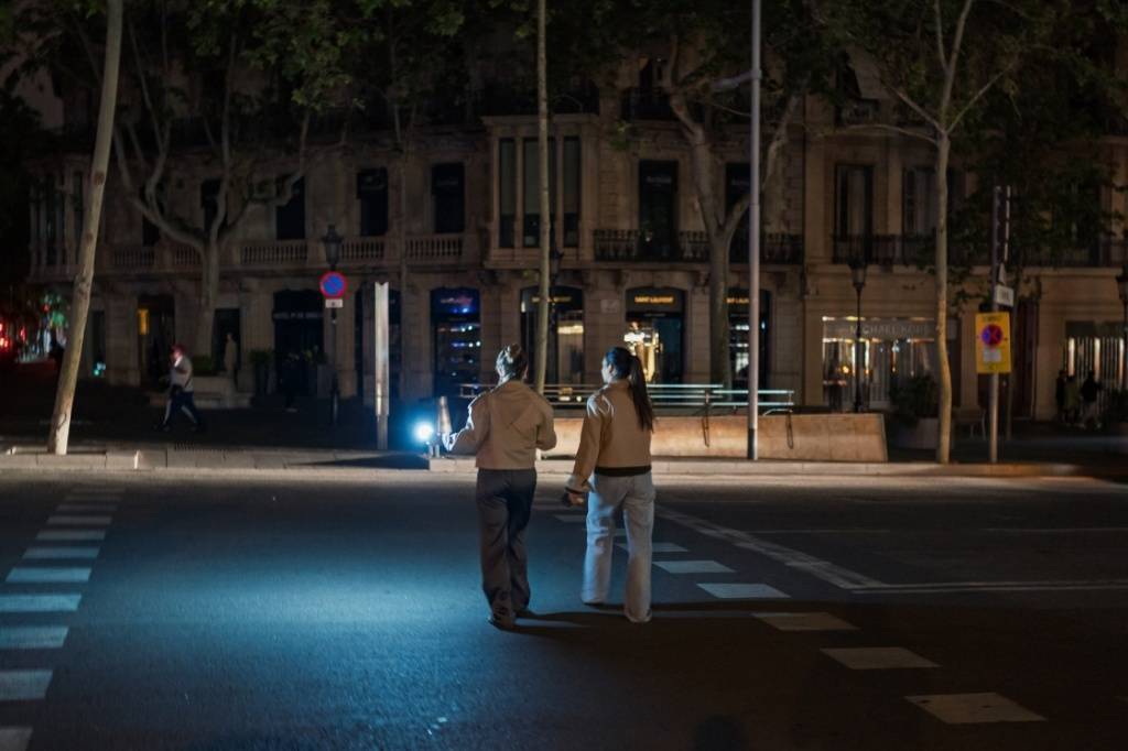4月28日,在西班牙巴塞罗那,一名女子用手机的手电筒照明穿过人行道。新华社 图
