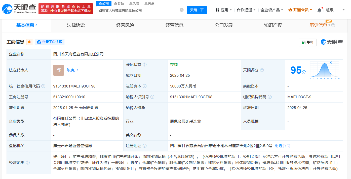 天眼查App显示,近日,四川省天府锂业有限责任公司成立,法定代表人为陈庚户,注册资本5亿人民币,经营范围包括矿产资源勘查、非煤矿山矿产资源开采、非金属矿及制品销售等。股东信息显示,该公司由四川省自然资源投资集团有限责任公司全资持股。