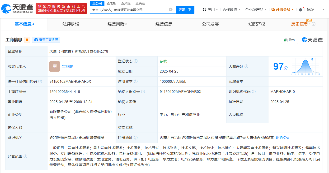 天眼查App显示,近日,大唐(内蒙古)新能源开发有限公司成立,法定代表人为宝丽娜,注册资本10亿人民币,经营范围包括太阳能发电技术服务、新兴能源技术研发、储能技术服务、专用设备修理等。股东信息显示,该公司由大唐新能源(HK.01798)全资持股。