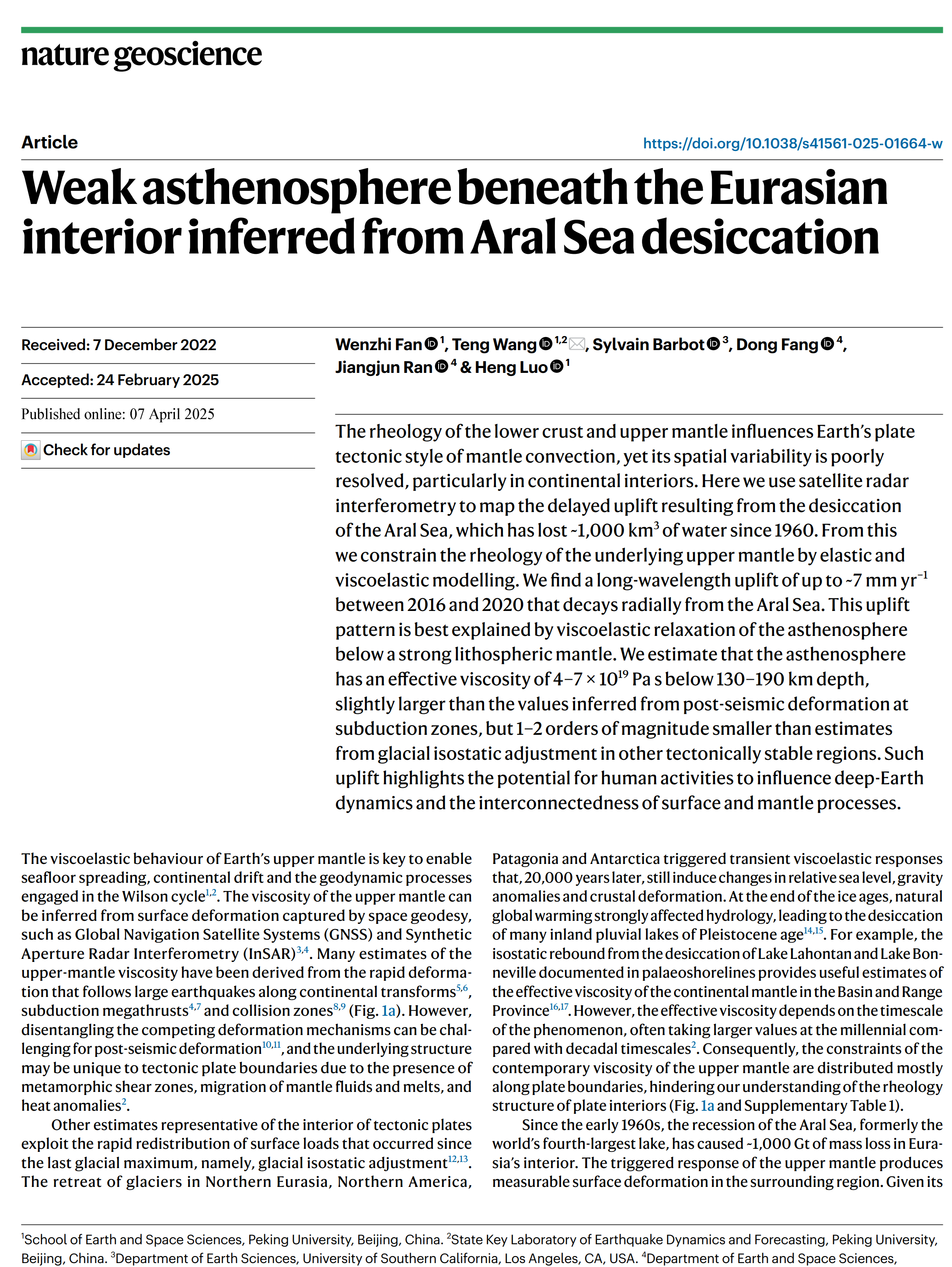 据北京大学地球与空间科学学院消息,近日,由北京大学地球与空间科学学院助理教授王腾团队牵头,联合美国南加州大学和南方科技大学等研究单位,在Nature Geoscience上发表了一项重要研究成果——“Weak asthenosphere beneath the Eurasian interior inferred from Aral Sea desiccation”。该研究发现,咸海在因为人类活动干涸后很长一段时间仍然存在持续的地面抬升现象,揭示了人类活动可以导致地幔中的岩石流动,引起地球内部深处的反应。该论文被选为Nature Geoscience期刊4月份封面文章,并被选为“亮点(highlight)”论文。