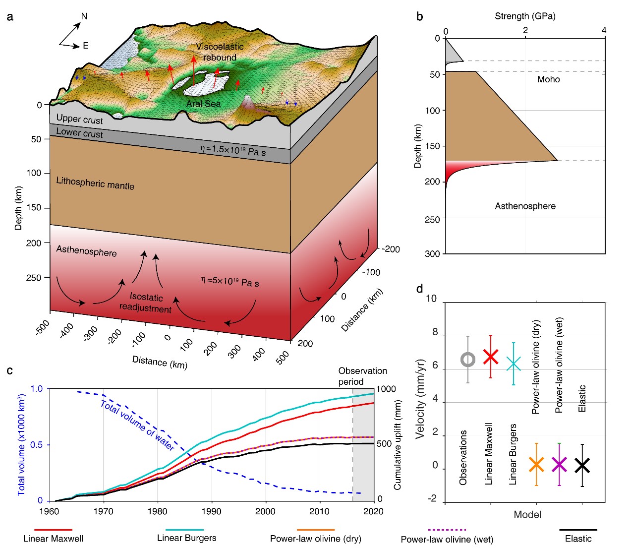 通常情况下,岩石具有黏弹性,如果岩石突然破裂,在几秒钟到几分钟内形成一个断层,那么它就会表现出弹性,产生地震。但是,当深部岩石在高温和高压下,会表现出流体的行为,通常用黏度来衡量流动性大小。咸海巨量的湖水会压低地下岩石,当这一质量被移除时,岩石就会就在短时间内进行反弹,就像释放被压缩的弹簧,同时,深部岩石的黏性效应会在更长的时间尺度上起作用产生回流,并在地表形成长期、缓慢的隆起。这样的地表形变通常只有每年几毫米到几厘米。