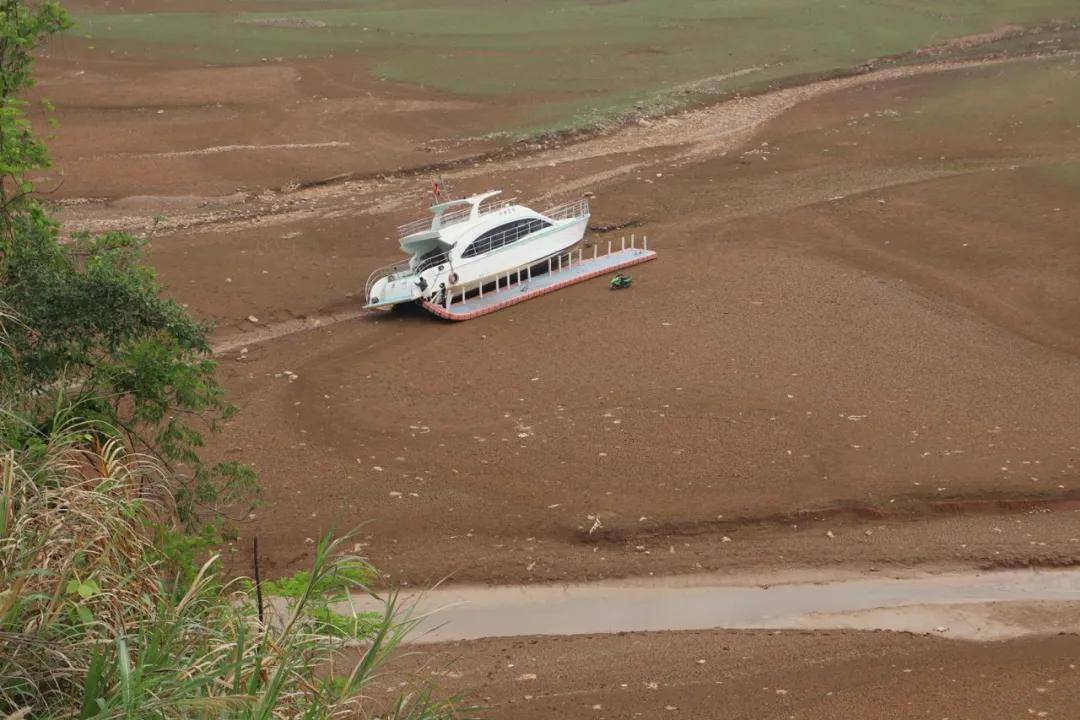 在距离东潭水库几公里的周家水库,也出现了大面积的干涸。4月26日,记者在周家水库现场看到,一艘名为“仙女壹号”的船艇正搁浅在水库中央,牛群自由地走在库底上面吃草,甚至还有当地人骑着电动车在上面游玩。