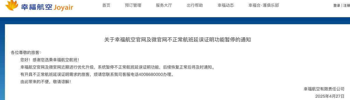 4月27日,有航空领域自媒体发文称,幸福航空内部发文取消今年“五一”假期前所有的航班。当晚,幸福航空官方网站发布《关于幸福航空官网及微官网不正常航班延误证明功能暂停的通知》,称近期进行优化升级,系统暂停不正常航班延误证明功能,后续恢复正常后将及时通知。