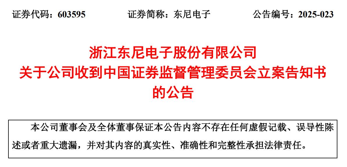 日前,东尼电子(603595)公告称,收到中国证券监督管理委员会(以下简称“证监会”)《立案告知书》,因公司涉嫌信息披露违法违规,根据有关法律法规,证监会决定对公司立案。