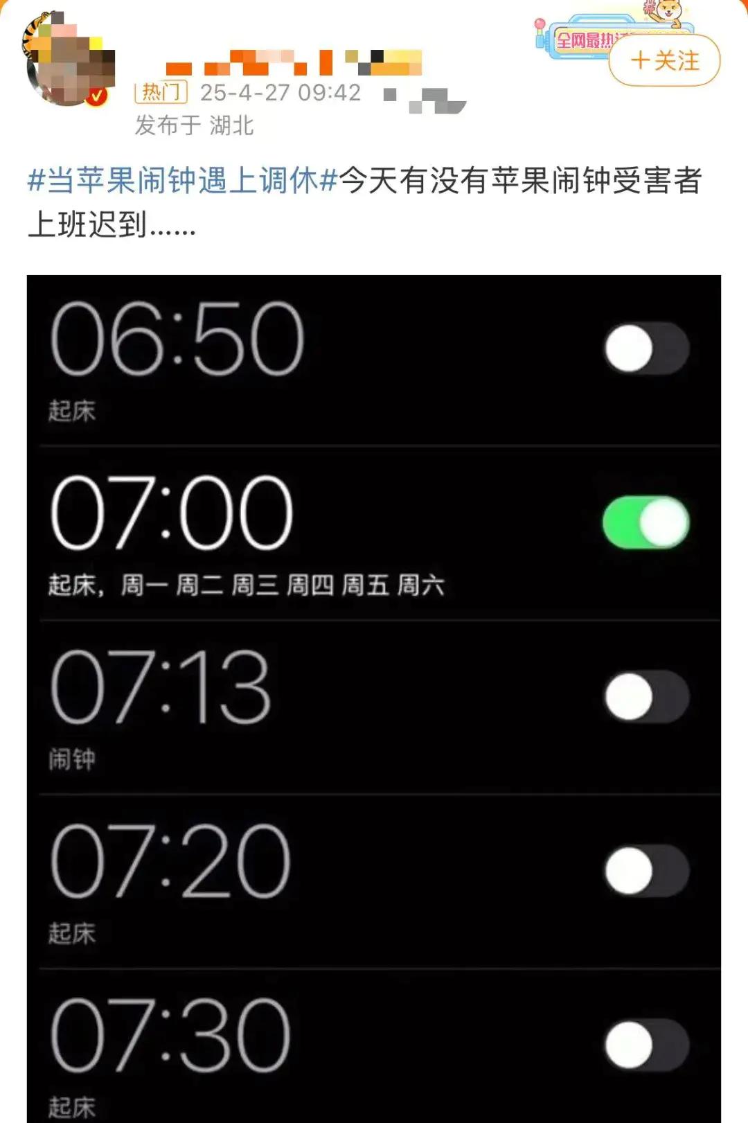 今天(4月27日),微博话题#调休##当苹果闹钟遇到调休#登上热搜榜,引发网友热议。