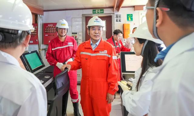 中国海油研究总院总工程师、钻完井专家李中与工作人员在作业现场进行交流沟通。中国海油 供图