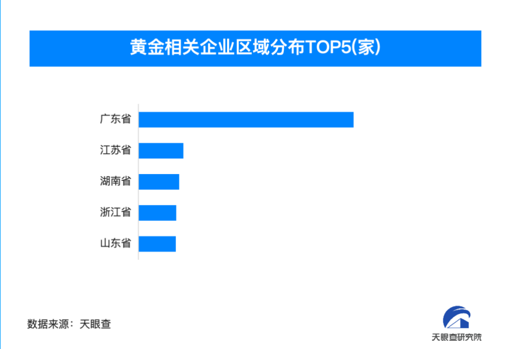 从地域分布看,广东省以超3.9万家黄金相关企业位居榜首,江苏省位居第二,湖南、浙江、山东紧随其后。