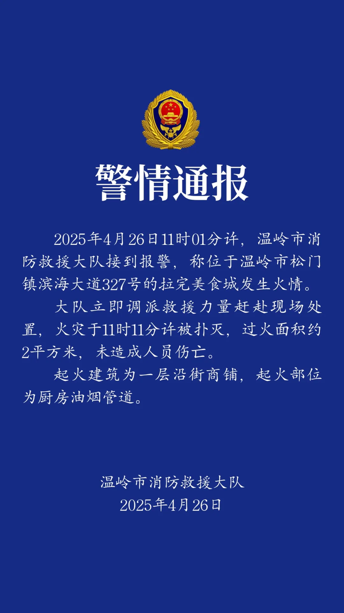 4月26日晚间,浙江温岭市消防救援大队发布警情通报:2025年4月26日11时01分许,温岭市消防救援大队接到报警,称位于温岭市松门镇滨海大道327号的拉完美食城发生火情。