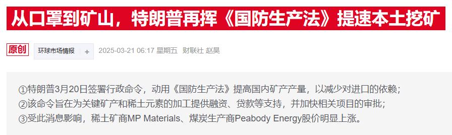 以稀土举例,根据美国地质调查局的数据,2024年美国80%的稀土依赖进口。上月,特朗普签署行政令,动用《国防生产法》为提高关键矿产产能提供资金和其他支持。