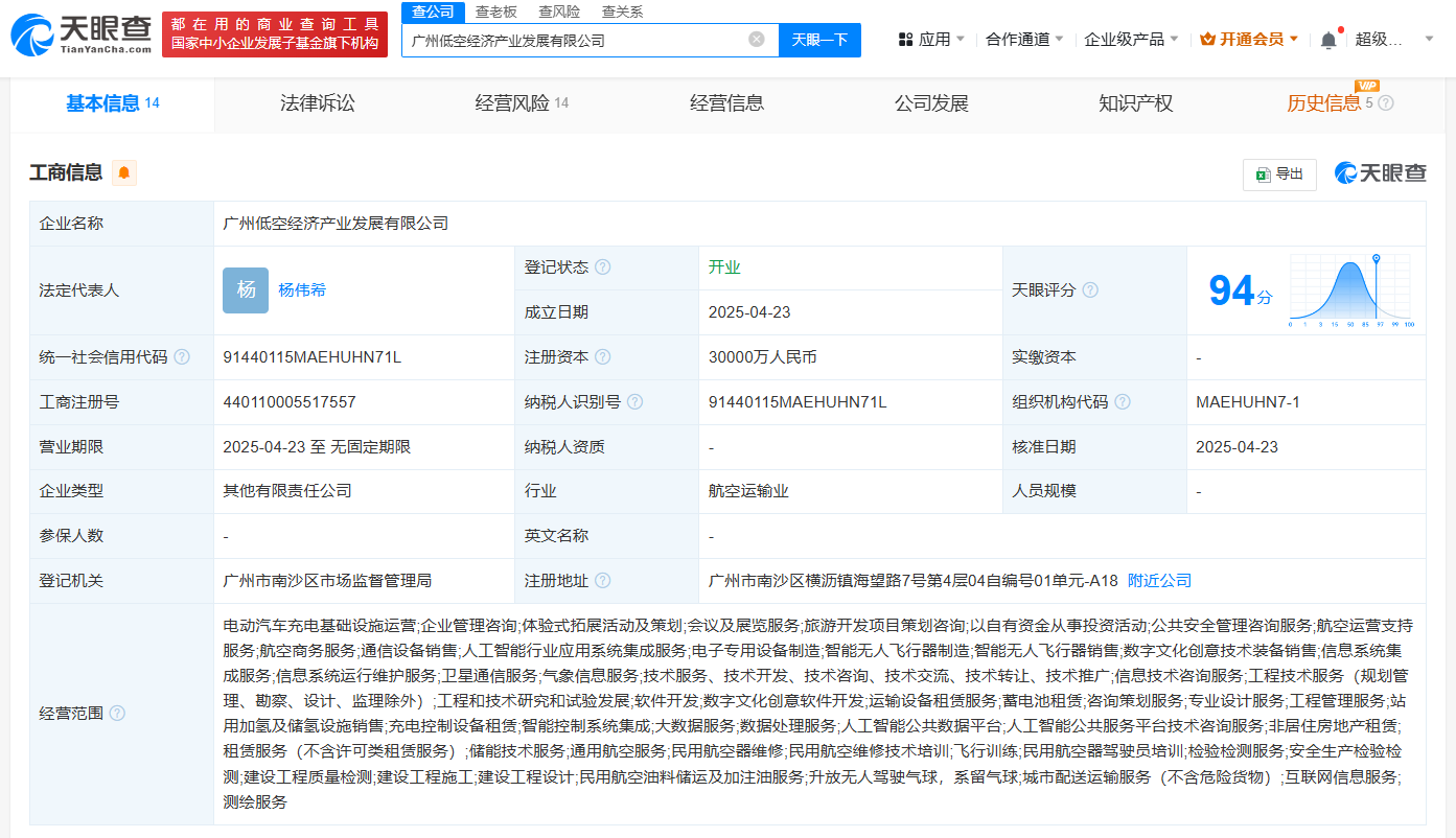 天眼查App显示,近日,广州低空经济产业发展有限公司成立,法定代表人为杨伟希,注册资本3亿人民币,经营范围包括人工智能行业应用系统集成服务、电子专用设备制造、智能无人飞行器制造、智能无人飞行器销售等。股东信息显示,该公司由广州数字科技集团有限公司、广州南沙资产经营集团有限公司、广州交通投资集团有限公司等共同持股。
