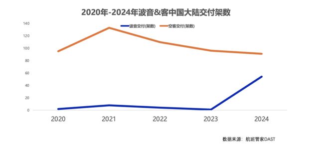2020到2023年,波音737MAX被停飞的4年间,波音仅向中国交付了13架飞机,虽然在2024年增加到54架,但只有空客对华交付量的一半。