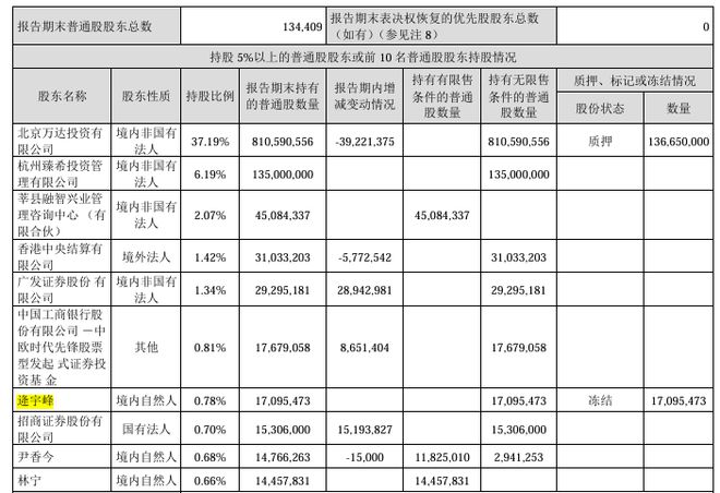 红星资本局翻阅万达电影年度、半年度财报注意到,逄宇峰最后一次出现是在2023年半年报中,其以0.78%的持股比例位列公司前十大股东。彼时,逄宇峰的持股数量为1709.55万股,股份状态为冻结。