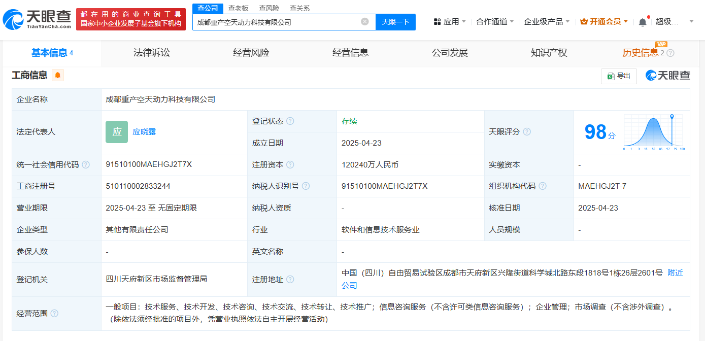 天眼查App显示,近日,成都重产空天动力科技有限公司成立,法定代表人为应晓露,注册资本约12亿人民币,经营范围包括技术服务、技术开发、技术咨询、技术交流、技术转让、技术推广等。股东信息显示,该公司由四川发展空天高端装备制造产业股权投资基金合伙企业(有限合伙)、成都市重大产业化项目二期股权投资基金有限公司共同持股。