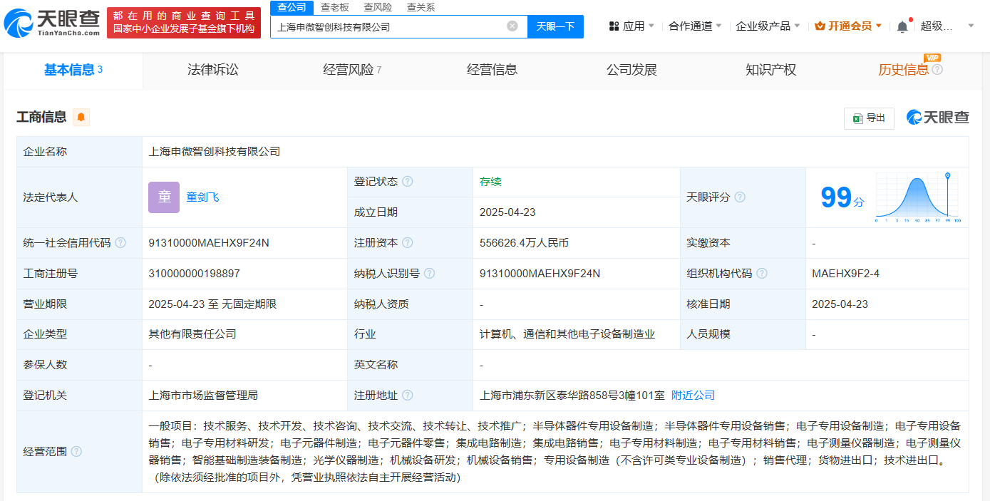 天眼查App显示,近日,上海申微智创科技有限公司成立,法定代表人为童剑飞,注册资本约55.66亿人民币,经营范围包括半导体器件专用设备制造、半导体器件专用设备销售、电子专用设备制造等。股东信息显示,该公司由上海张江(集团)有限公司全资持股。
