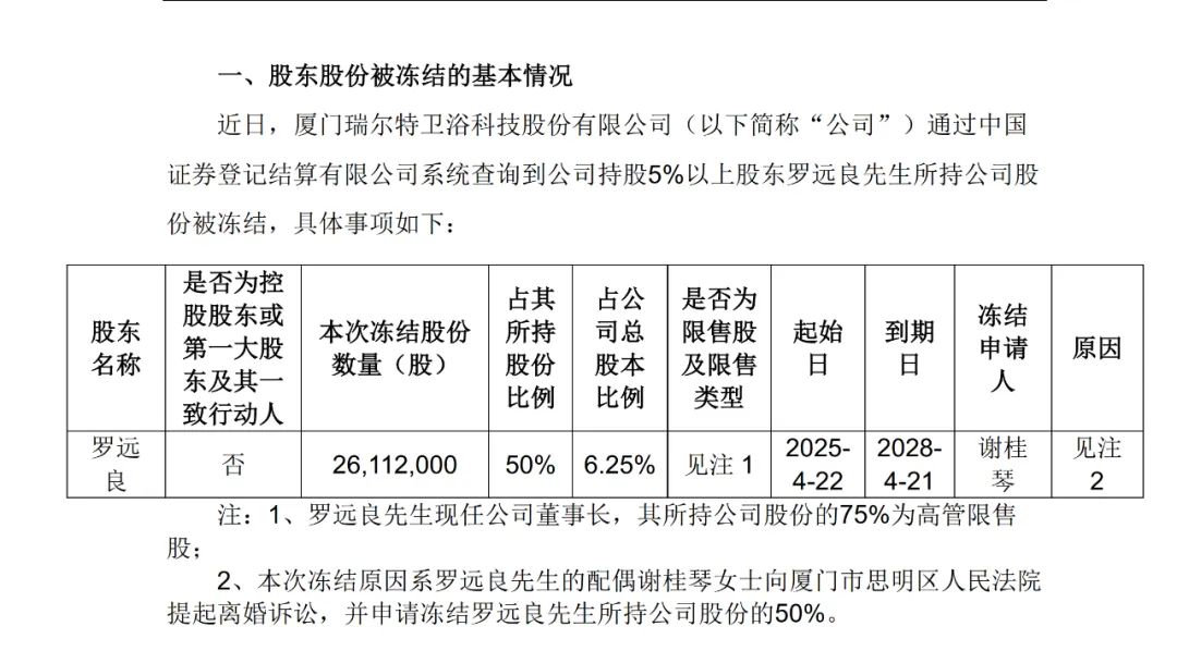 对于冻结原因,瑞尔特表示,罗远良的配偶谢桂琴女士向厦门市思明区人民法院提起离婚诉讼,并申请冻结罗远良所持公司股份的50%。