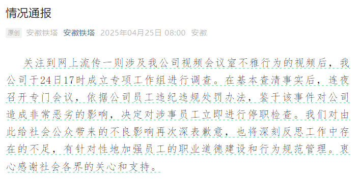 此前,“安徽铁塔”曾在4月24日深夜发布声明称,近日,网上流传一则涉及我公司“指挥调度中心”大屏播放会议室不雅行为的视频,我公司关注到相关情况后,已第一时间成立专项工作组进行调查。