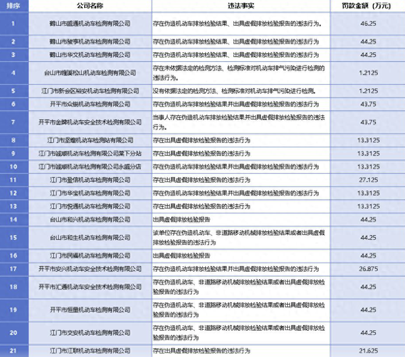 据信用中国(广东・江门)平台公示信息显示,自去年底至2025年4月,江门市超20家机动车检测公司因伪造机动车排放检验结果、出具虚假排放检验报告等违法行为受到江门市生态环境局处罚,罚款总额超630万元。这些违规企业分布于蓬江区、江海区、新会区以及台山市、开平市、鹤山市等区市,单家处罚金额最高达46.25万元,最低为1.2125万元 。