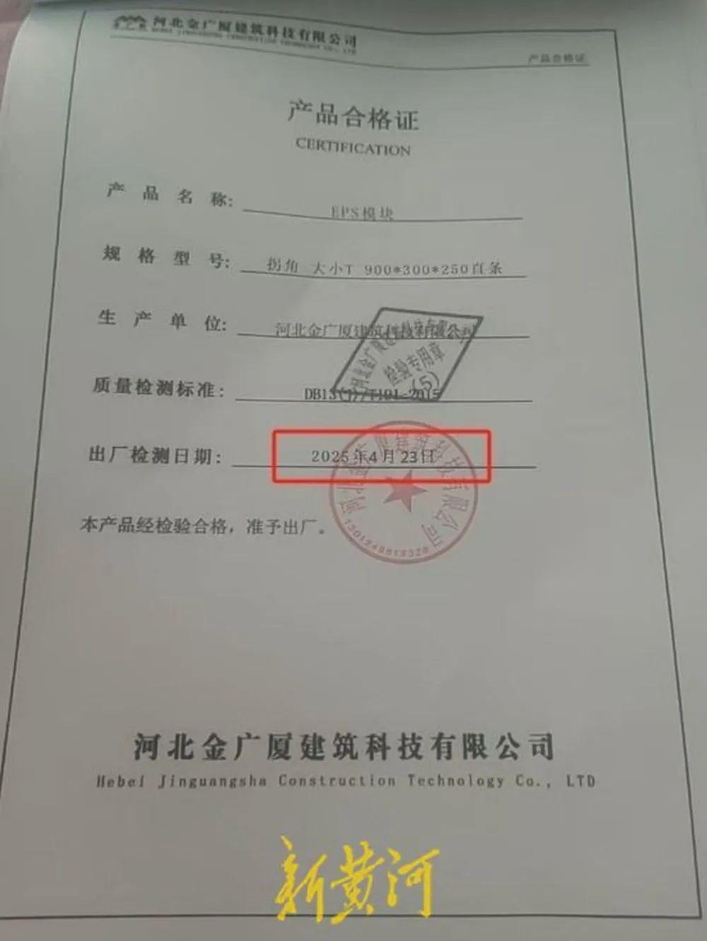 根据一份金广厦公司提供给施工方的检测报告显示,2024年7月12日,金广厦委托河北省建筑机械材料设备产品质量监督站作出检测符合B1级的报告。但令人震惊的是,该批产品合格证竟然显示出厂日期为2025年4月23日,而事发时间却是4月15日。