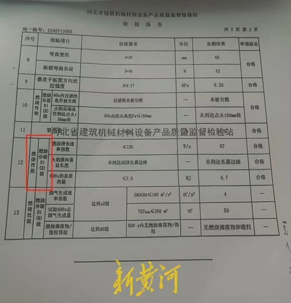中国建筑科学研究院防火研究所高级工程师季广其告诉新黄河记者:“正常情况下,B1级是难燃的,用打火机是打不着的。上述这种火势,肯定达不到检测报告中燃烧增长速率指数和600秒总放热量,肯定达不到B1级。”