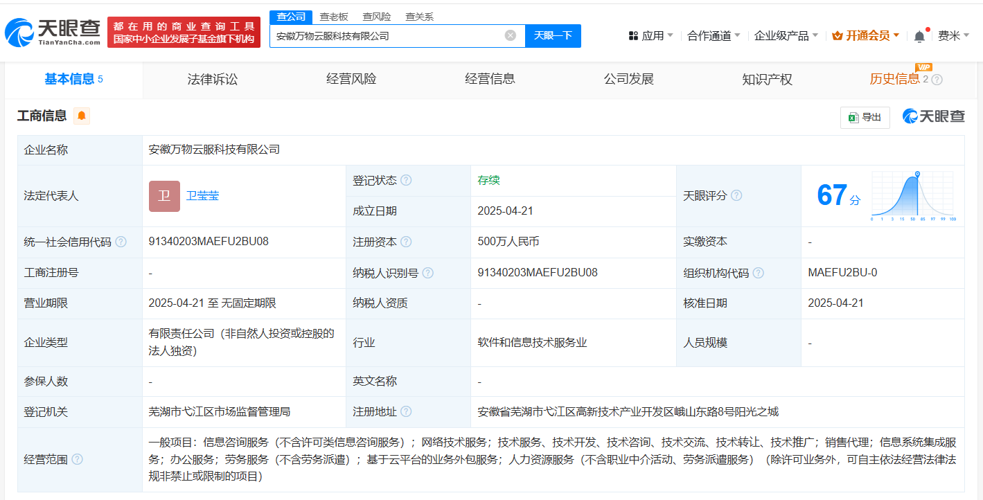 天眼查App显示,近日,安徽万物云服科技有限公司成立,法定代表人为卫莹莹,注册资本500万人民币,经营范围包括信息咨询服务、网络技术服务、销售代理、信息系统集成服务、办公服务、基于云平台的业务外包服务等。股权全景穿透图显示,该公司由三只松鼠(300783)旗下星星点灯(芜湖)投资管理有限公司全资持股。