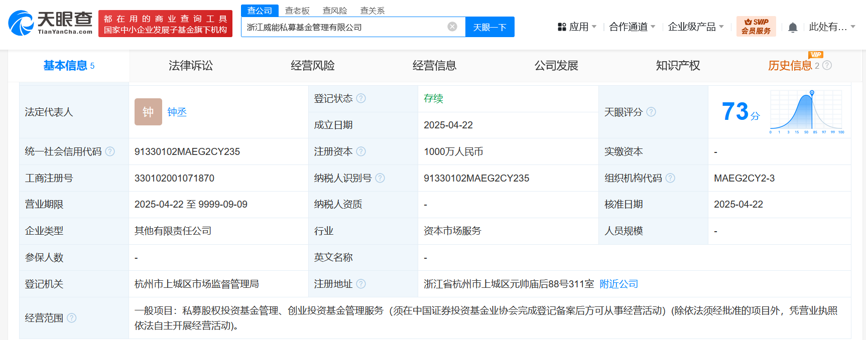天眼查App显示,近日,浙江威能私募基金管理有限公司成立,法定代表人为钟丞,注册资本1000万人民币,经营范围为私募股权投资基金管理、创业投资基金管理服务。股东信息显示,该公司由超威电源集团有限公司、浙江瑞宝新能源有限公司、杭州煜翎企业管理合伙企业(有限合伙)共同持股。