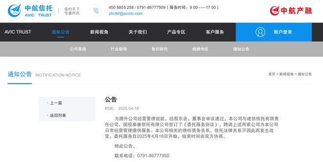 这样一家“看起来很强”的信托机构却突然宣布“被托管”。中航信托近日公告称,为提升公司经营管理效能,经股东会、董事会审议通过,本公司与建信信托有限责任公司、国投泰康信托有限公司签订了《委托服务协议》,聘请上述两家公司为本公司日常经营管理提供服务。本公司相关的债权债务关系、信托法律关系不因此而发生改变。委托服务自2025年4月18日开始,结束时间由双方协商。