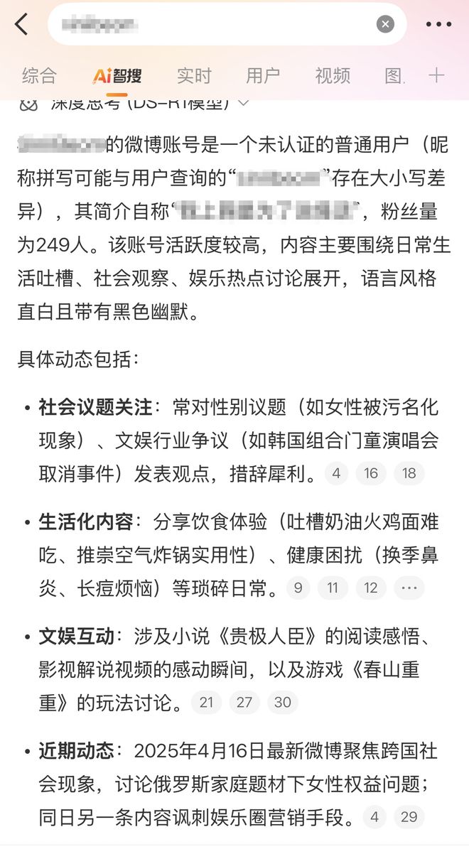 当你搜索某一事件时,AI可以帮你快速总结整起事件的来龙去脉,但在精准搜索某一个人、某一个小众网名时,AI强大的搜索、分析、总结能力也让部分人不寒而栗。