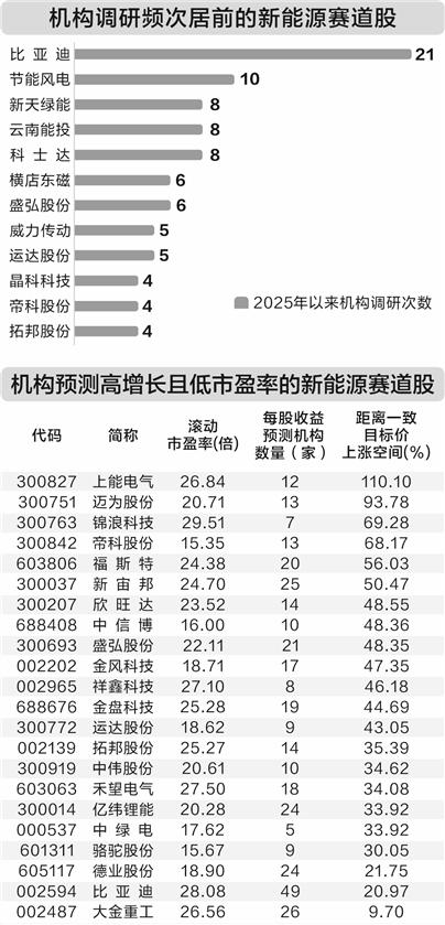 从未来增长潜力来看,根据5家及以上机构一致预测,据数据宝统计,49只新能源赛道股今明两年净利润增速均有望超20%。比亚迪、亿纬锂能、晶科能源、德业股份、国轩高科等龙头股榜上有名。