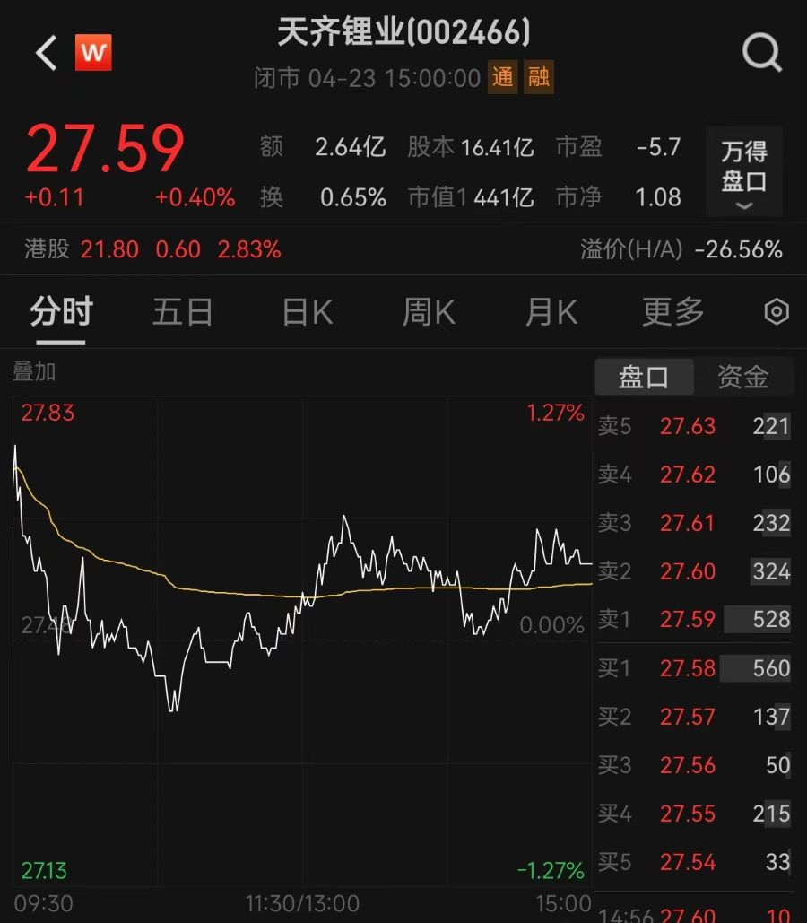 截至今日收盘,天齐锂业小幅上涨0.40%,股价报27.59元/股,总市值达441亿元。