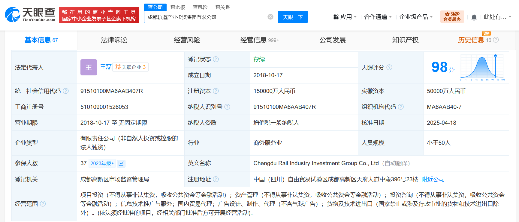 该公司成立于2018年10月,法定代表人为王磊,经营范围为项目投资,资产管理,投资咨询,信息技术推广与服务,国内贸易代理,广告设计、制作、代理,货物及技术进出口,由成都轨道交通集团有限公司全资持股。