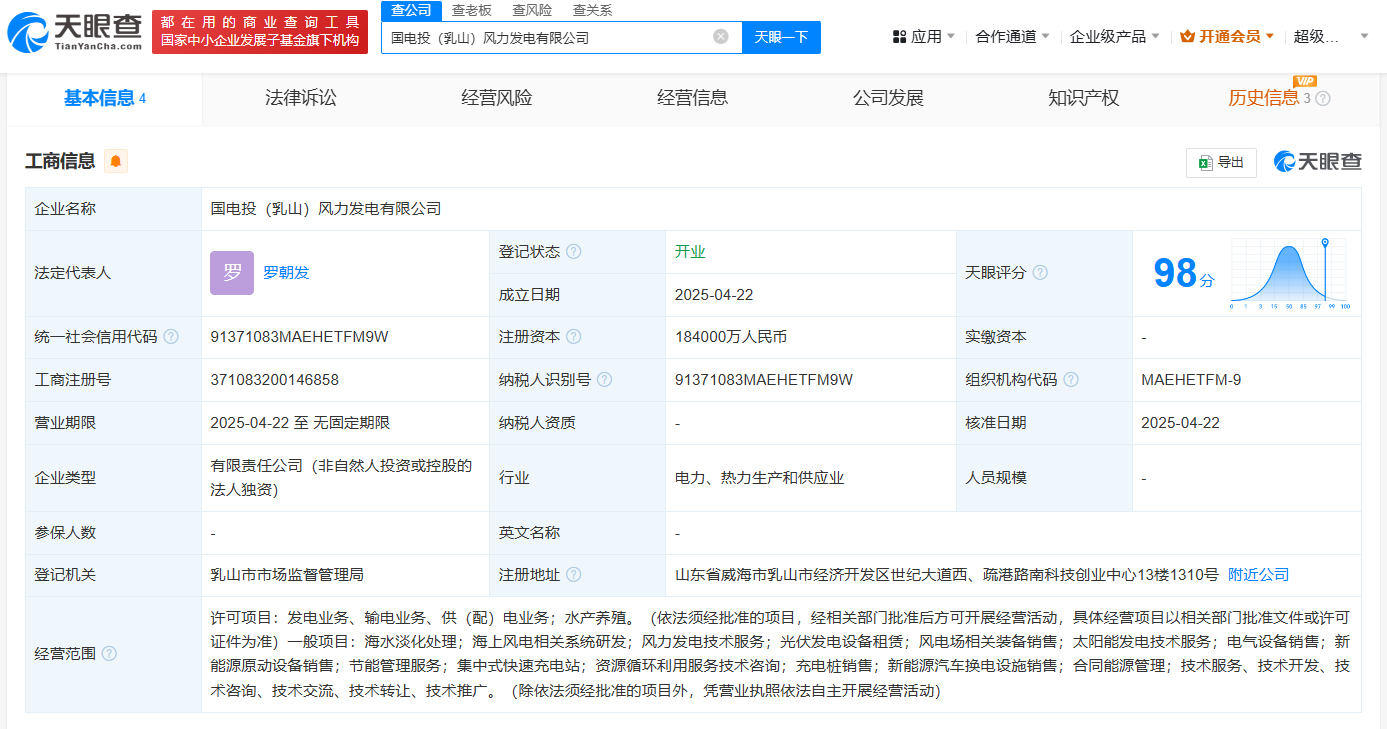 天眼查App显示,近日,国电投(乳山)风力发电有限公司成立,法定代表人为罗朝发,注册资本18.4亿人民币,经营范围包括海水淡化处理、海上风电相关系统研发、风力发电技术服务、光伏发电设备租赁等。股权全景穿透图显示,该公司由中国电力(HK.02380)旗下国家电投集团山东能源发展有限公司全资持股。