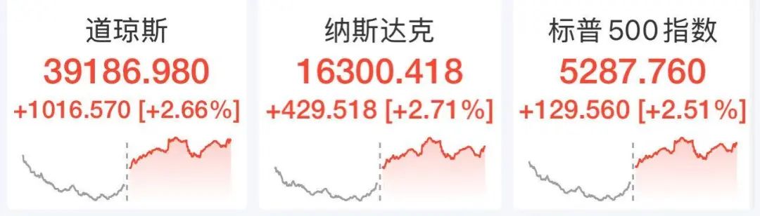 当地时间4月22日,美股大幅收涨,道指上涨1016.57点,涨幅2.66%;纳指上涨429.52点,涨幅2.71%;标普500指数上涨129.56点,涨幅2.51%。