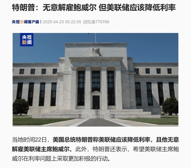 当地时间4月22日,特朗普改口称他无意解雇鲍威尔,希望他在利率问题上采取更积极的行动。