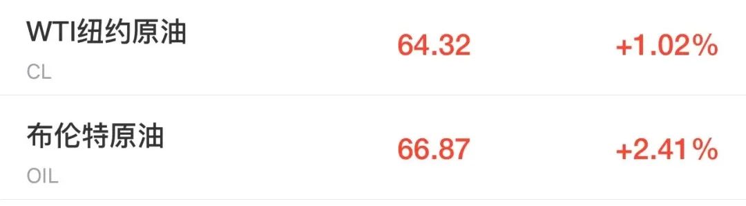 原油上涨,WTI原油期货涨超1%,布伦特原油期货涨超2%。