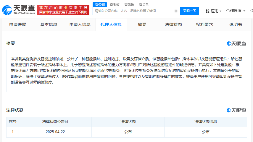 天眼查App显示,近日,珠海格力电器股份有限公司申请的“一种智能指环、控制方法、设备及存储介质”专利公布。