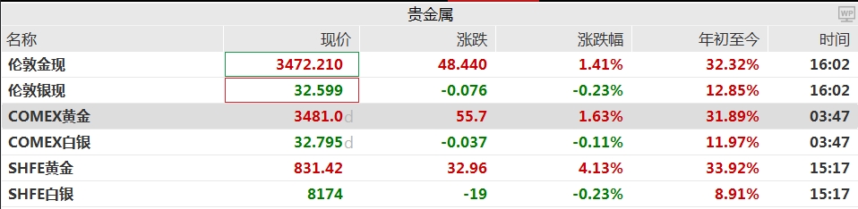 现货黄金盘中涨逾2%,史上首次突破3500美元/盎司关口,年内累涨逾33%。截至发稿,现货黄金涨约1.41%,报3472.21美元/盎司。与此同时,COMEX黄金也持续创新高,盘中最高达到3509.9美元,日内涨近1.7%。年内至今,现货黄金累涨32.32%,COMEX黄金累涨31.89%。