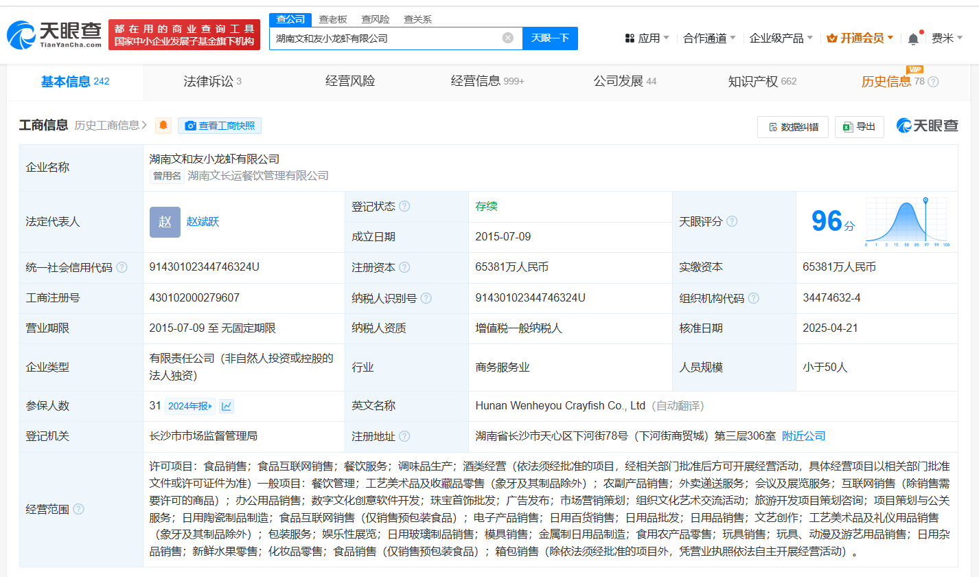 该公司成立于2015年7月,注册资本约6.5亿人民币,经营范围包括食品销售、餐饮服务、调味品生产等,由湖南文和友城市文化传播研究院有限公司全资持股。