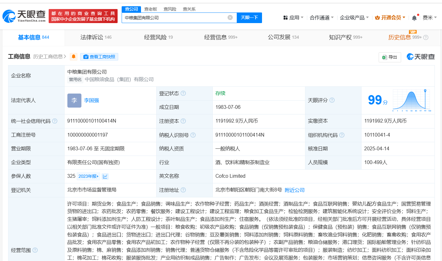该公司成立于1983年7月,注册资本约119.2亿人民币,经营范围包括期货业务、食品生产、食品销售、调味品生产、农作物种子经营、药品生产等,由中华人民共和国国务院全资持股。据媒体此前报道,中粮集团官网“管理团队”栏目更新信息显示,李国强已任中粮集团党组书记、董事长。