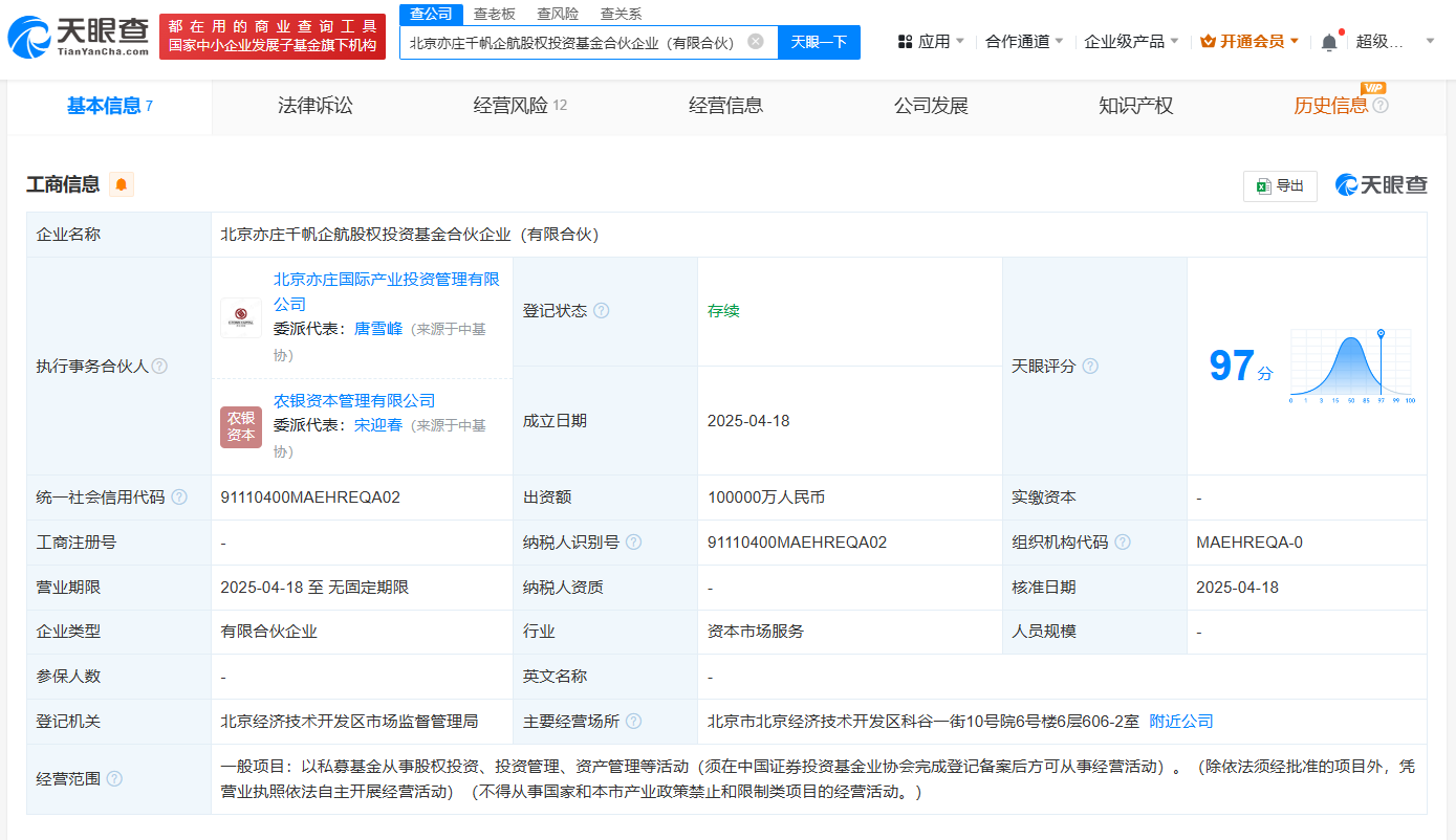 天眼查App显示,近日,北京亦庄千帆企航股权投资基金合伙企业(有限合伙)成立,执行事务合伙人为北京亦庄国际产业投资管理有限公司、农银资本管理有限公司,出资额10亿人民币,经营范围包括以私募基金从事股权投资、投资管理、资产管理等活动。合伙人信息显示,该基金由北京亦庄国际投资发展有限公司、农银金融资产投资有限公司、农银资本管理有限公司、北京亦庄国际产业投资管理有限公司共同出资。